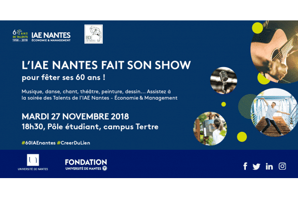 « Pour fêter nos 60 ans nous voulions mettre en avant deux principes qui nous sont chers : « Créer du lien » et « Former sans formater ». Cette soirée d’ouverture qui lance le top départ des nombreux événements anniversaires que nous allons proposer tout au long de l’année universitaire, a pour ambition tout simplement de rassembler la communauté IAE Nantes (diplômés, personnels, étudiants) dans toute sa diversité et avec tout son potentiel, son talent que nous lui connaissons bien. C’est l’occasion encore et toujours de créer du lien entre les différents acteurs qui composent le cœur de notre institut. La soirée a également reflété la caractéristique particulière qui nous porte depuis des années « Former sans formater » ! En effet, en exposant les talents transversaux de chacun, nous démontrons que quelque soit le rôle tenu à l’IAE Nantes, enseigner, développer des compétences, apprendre, transmettre son expérience ou œuvrer pour faire avancer cette grosse machine qu’est un institut, chacun cultive ses passions et sa différence et c’est ce que l’IAE Nantes souhaite encourager. »