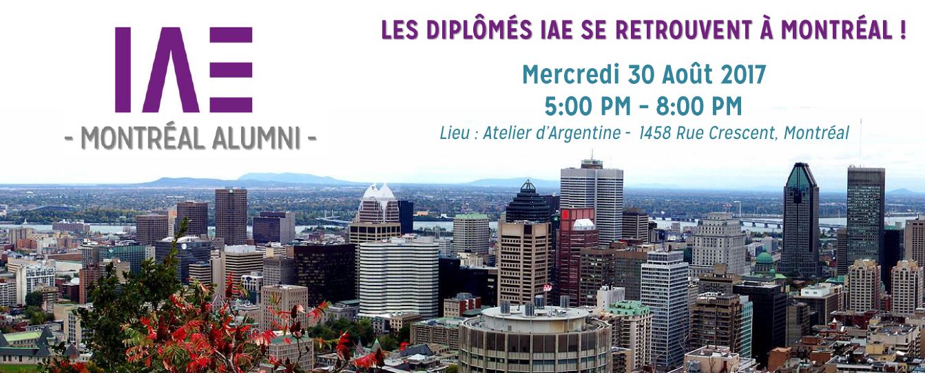 Le mercredi 30 Août sera l’occasion pour les Alumni IAE présents à Montréal d’élargir leur cercle de contacts et de partager leurs expériences et conseils avec les nouveaux arrivants au Canada. Le réseau des diplômés Montréalais aura également la chance de compter sur la présence de Sarah Lempereur, Directrice Exécutive du réseau IAE FRANCE qui sera accompagnée d’une délégation d’étudiants de plusieurs IAE venus intégrer la célèbre université de McGill pour un semestre dans le cadre d’un accord entre les deux entités.