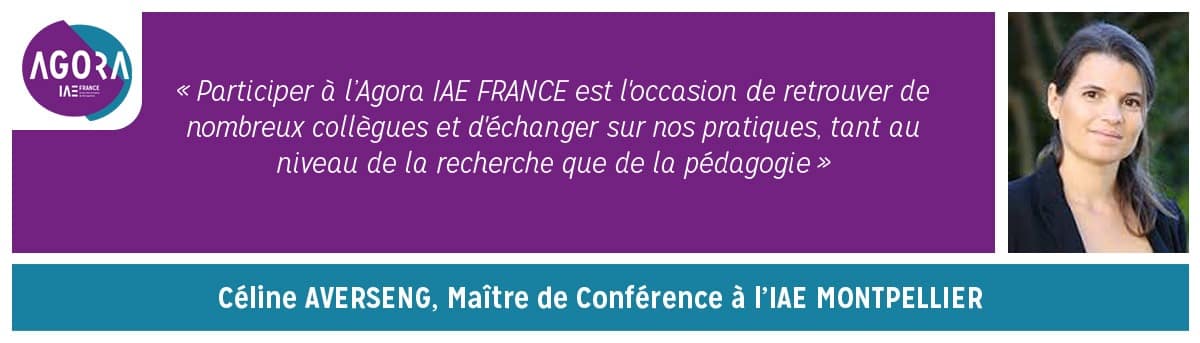 Maître de Conférence à l’IAE de Montpellier et particulièrement intéressée par tout ce qui touche à l’innovation pédagogique, Céline AVERSENG oriente ses recherches sur le management des processus et l’innovation pédagogique. Soucieuse d’échanger et de partager ses bonnes pratiques tant au niveau de la recherche que de la pédagogie avec les collègues qui seront présents lors de l’Agora IAE FRANCE, elle interviendra dans deux ateliers :