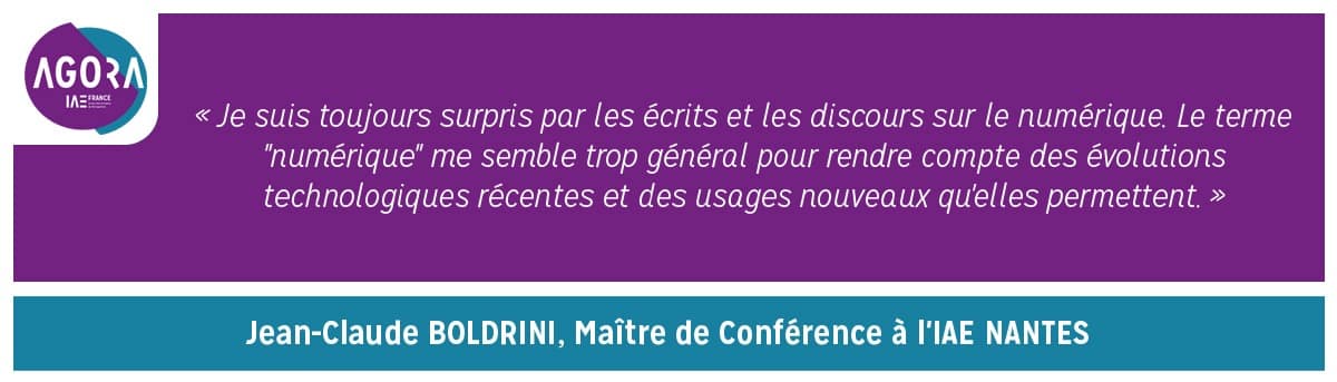 Toujours surpris par les écrits et les discours sur le numérique, il a souhaité participer à l’Agora IAE FRANCE. En effet, le terme « numérique » lui semble trop général pour rendre compte des évolutions technologiques récentes et des usages nouveaux qu’elles permettent. Par ailleurs, le phénomène « numérique » est loin d’être récent ce qui lui semble être souvent occulté, oublié ou ignoré.