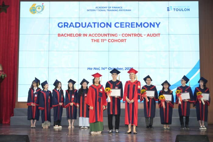Présidée par le recteur AOF, le professeur NGUYEN Trong Co et le directeur adjoint du projet international de formation M. TA Huy Hung, la cérémonie de remise des diplômes a été une occasion solennelle pour les étudiants du programme délocalisé de l’Academy Of Finance à Hanoï. Parmi eux, 91 diplômés ont obtenu leur licence 3 CCA, 34 ont obtenu leur master en finance et sont désormais prêts à se lancer dans leur carrière professionnelle.