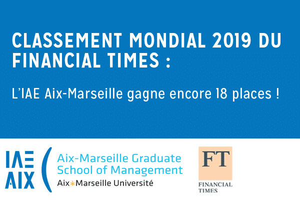 Dans le Global Ranking, l’Établissement figure désormais à la 33ème place mondiale. Une progression remarquable de 18 places par rapport à 2018, où l’IAE était 51ème. Pour la France, le FT classe l’IAE Aix-Marseille à la 7ème position des Écoles de commerce. Au niveau des écoles françaises, l’IAE Aix-Marseille avec sa 33ème place se classe derrière l’EDHEC et devant EM Lyon (40), NEOMA (43), Audencia (46), Grenoble Ecole de Management (47), KEDGE (49), Toulouse Business School (62) …