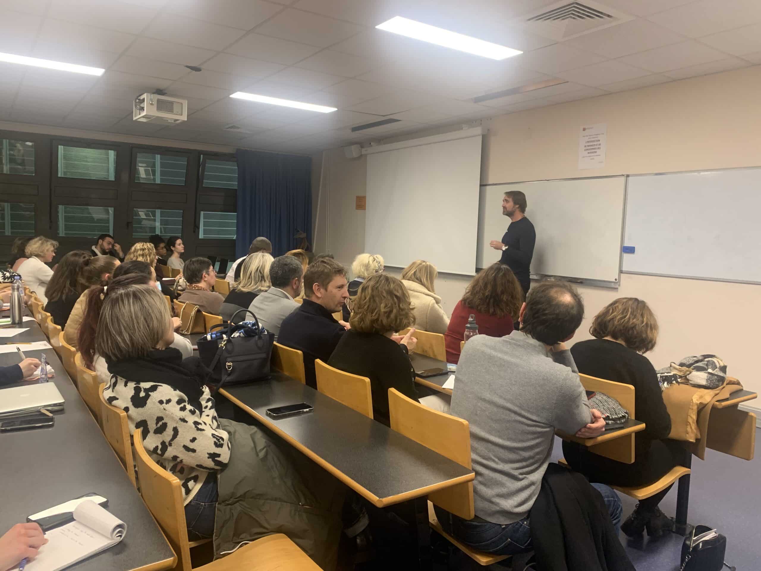 Étudiants, professionnels RH et de la prévention en santé étaient au RDV. C’est dans un amphi plein que Vincent a pu porter un discours fort qui appelle à la transformation de la conception de la santé au travail. Des axes de progrès clairs à développer en répondant au bon sens : l’écoute du travail réel, le courage managérial …