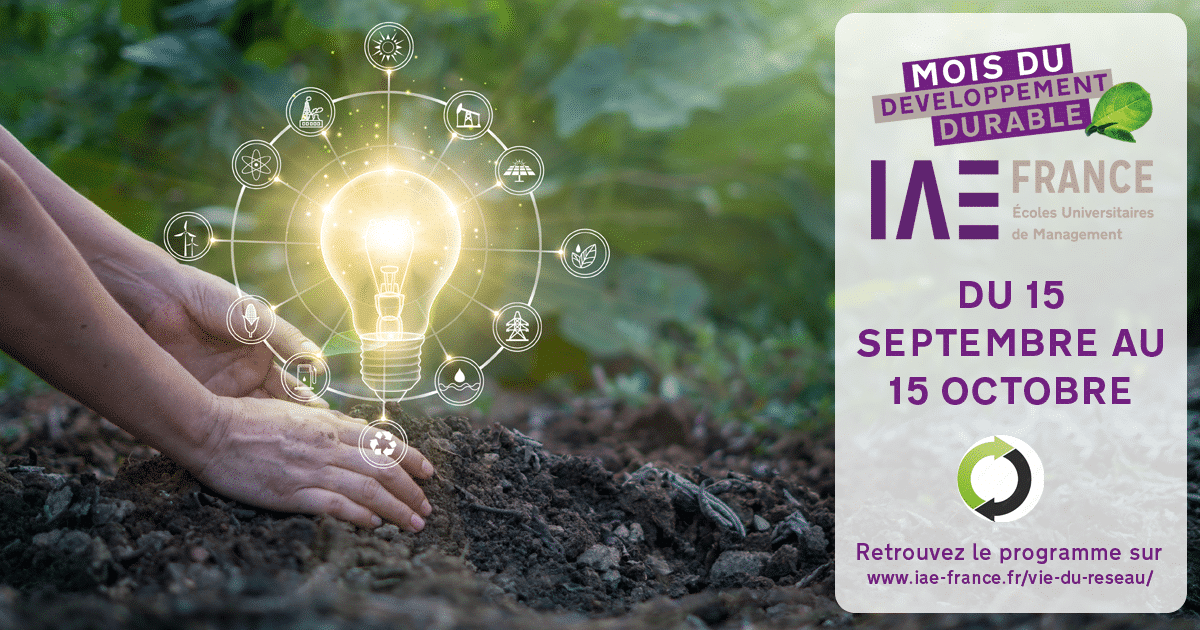 C’est dans ce contexte qu’IAE FRANCE organise, pour la 2ème année consécutive, le Mois du Développement Durable du 15 septembre au 15 octobre 2022. Lors de ce mois thématique, nous souhaitons sensibiliser notre communauté à l’urgence d’agir, mais aussi valoriser les initiatives et projets menés au sein des IAE : projets étudiants / alumni, travaux de recherches portés par le corps enseignant ou encore l’offre de formations existantes dans les 37 IAE autour du développement durable, de l’économie sociale et solidaire, de l’écologie ou encore de la RSE/RSO.