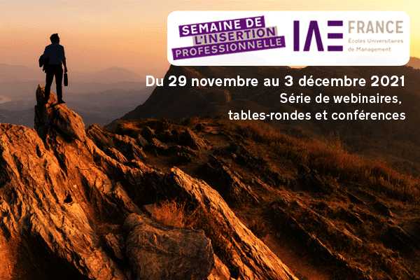 Du 29 novembre au 3 décembre 2021, IAE FRANCE organise la deuxième édition de « La Semaine de l’insertion professionnelle ». Raison d’être des IAE qui œuvrent chaque jour à la transmission de savoirs, de savoir-faire et de savoir-être à leurs étudiants, au plus proche du marché de l’emploi, le sujet de l’insertion professionnelle sera abordé de différents points de vue. L’objectif de cette semaine thématique est double : faire connaître les partenaires d’IAE FRANCE à l’ensemble de la communauté IAE, mais aussi mettre en avant les actions mises en place par les IAE et IAE FRANCE pour accompagner les étudiants dans la construction de leur projet professionnel.