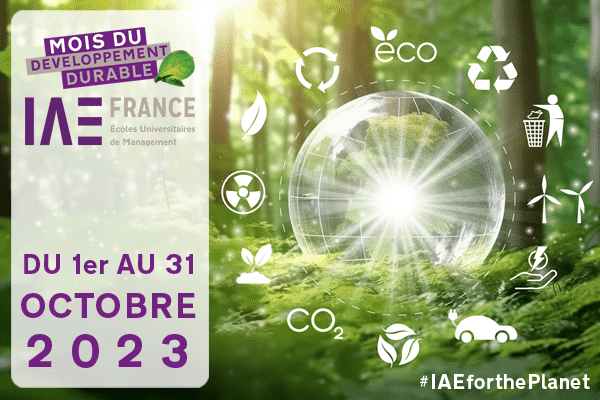 C’est dans ce contexte qu’IAE FRANCE se mobilise et organise pour la 3ème année consécutive, le Mois du Développement Durable en octobre 2023, en lien avec la Semaine Européenne du Développement Durable qui se tiendra cette année du 18 septembre au 8 octobre. Lors de ce mois thématique, nous souhaitons sensibiliser notre communauté à la transition écologique et à l’urgence d’agir, valoriser les initiatives et projets menés au sein des IAE mais aussi accompagner le passage à l’action.