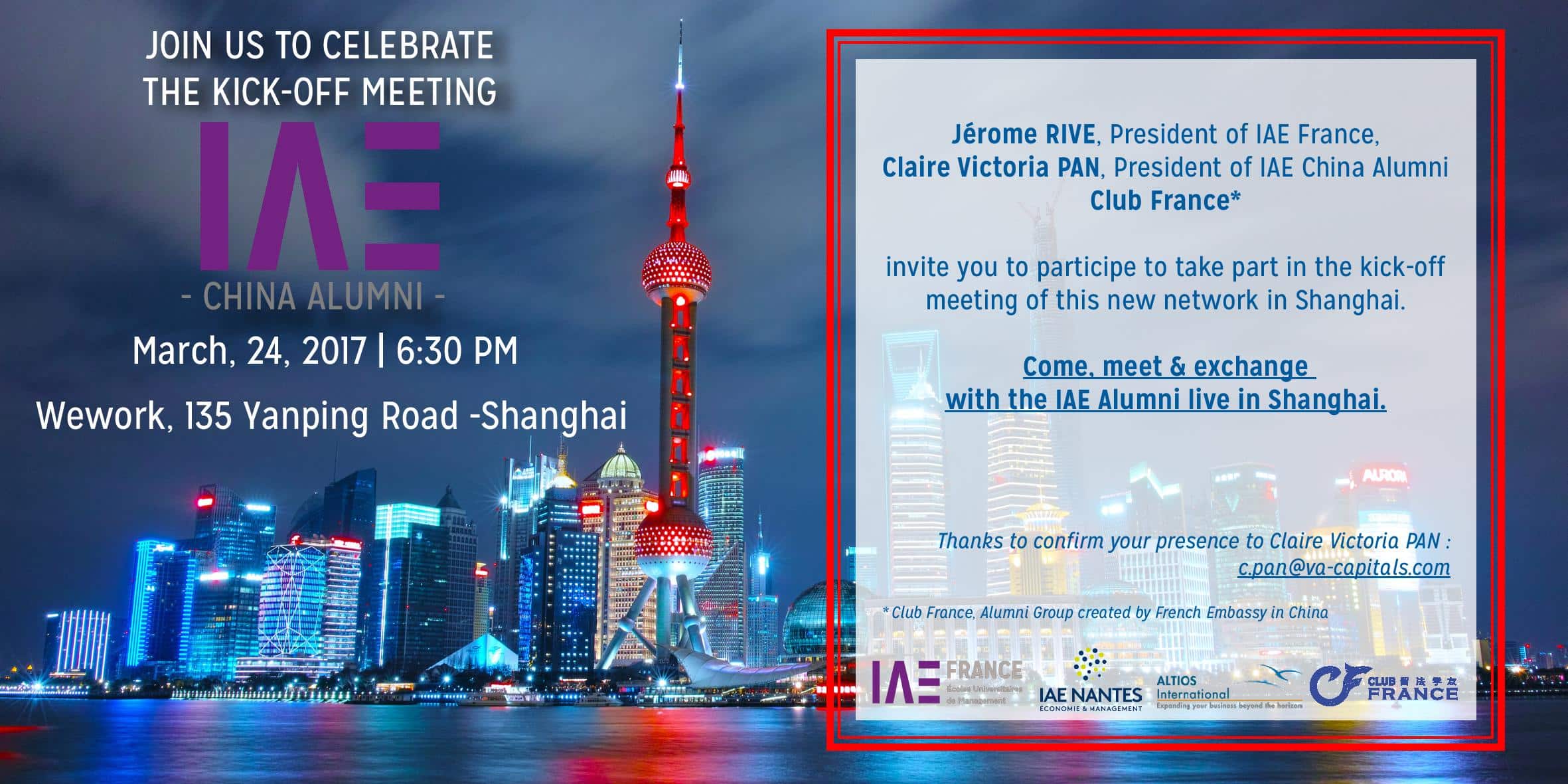 Partant du constat que de nombreux diplômés IAE vivent aujourd’hui à l’étranger et en nombre dans des villes comme Shanghai et Pékin, Claire Victoria Pan, Diplômée de l’IAE Lille et d’origine hongkongaise, a soumis l’idée à IAE FRANCE de fédérer un réseau de diplômés inter-IAE en Chine. Accompagnée d’autres diplômés IAE (Xue LI de l’IAE Lille, Jingwen LI de l’IAE Grenoble et Xinyu LIU de l’IAE Poitiers), Claire a ainsi constitué un bureau pour piloter cette association et ainsi développer les relations entre diplômés IAE vivant en Chine, en mettant en place un ensemble significatif d’actions stratégiques pour promouvoir et établir des relations durables avec les diplômés mais aussi avec IAE FRANCE, ses membres, ses étudiants et partenaires. Nous invitons tous les diplômés IAE présents en Chine à rejoindre ce réseau en se connectant au groupe IAE_France sur le réseau social wechat.