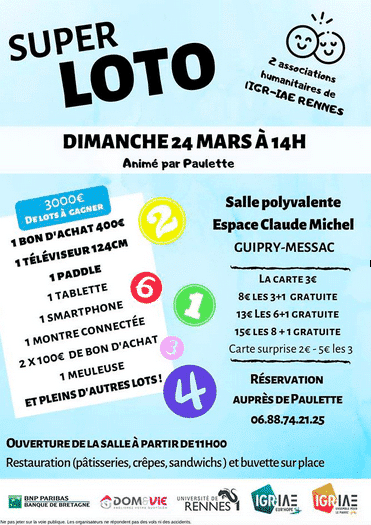 Save The Date : N’hésitez pas à venir nombreux au loto organisé le dimanche 24 mars, à GUIPRY-MESSAC (35) par l’IGR Eur’hope !