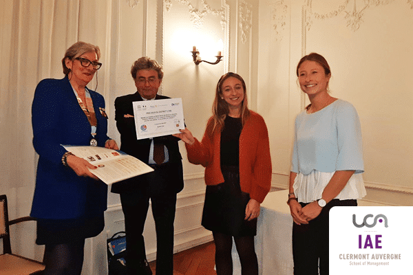 Catherine Gil, gouverneure du District 1740 et Alain Gazel, coordinateur régional du concours et membre du club Rotary de Clermont/Chamalières, ont remis le prix de l’éthique professionnelle à deux étudiantes de la promo (Laura Cardon et Nolwenn Lanoé) en présence de Eléonore Marbot et Pierre Chaudat, enseignants-chercheurs à l’IAE Auvergne. Les étudiants ont également reçu une mention au niveau national et un diplôme de la part de l’Unesco pour ce travail.