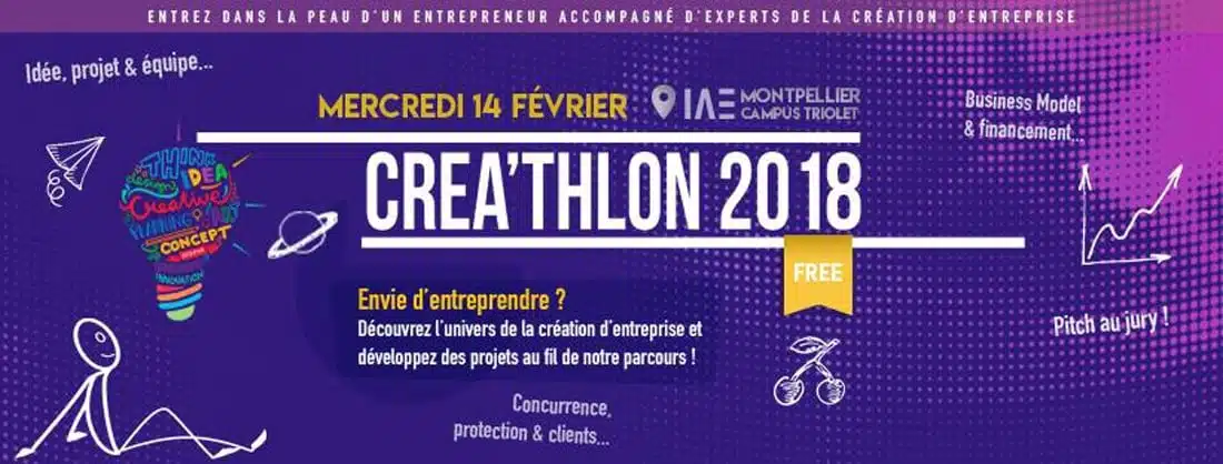 Le mercredi 14 février 2018, de 9h à 20h, l’IAE MONTPELLIER et l’association IAE Startup Lab organisent la 5ème édition du Créa’thlon, dans les locaux de l’IAE, campus Triolet (Place Eugène Bataillon). Vous avez un projet de création d’entreprise ou souhaitez simplement découvrir cet univers en intégrant une équipe ? Alors ne manquez pas cet événement !