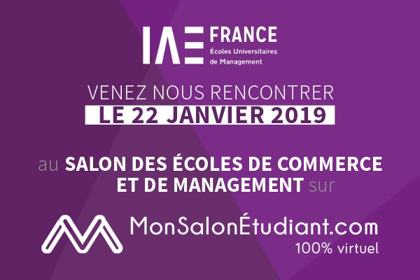 Nouveauté pour IAE FRANCE : cette année, le réseau participera pour la première fois au salon virtuel des écoles de commerce et de management MonSalonÉtudiant.com. MonSalonÉtudiant.com est un concept novateur qui permet aux étudiants et aux écoles de se rencontrer sans se déplacer !