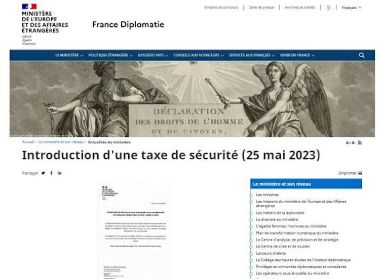 Capture d’écran du faux site du ministère des Affaires étrangères, où est « annoncée » une nouvelle taxe visant à financer l’effort de guerre ukrainien.