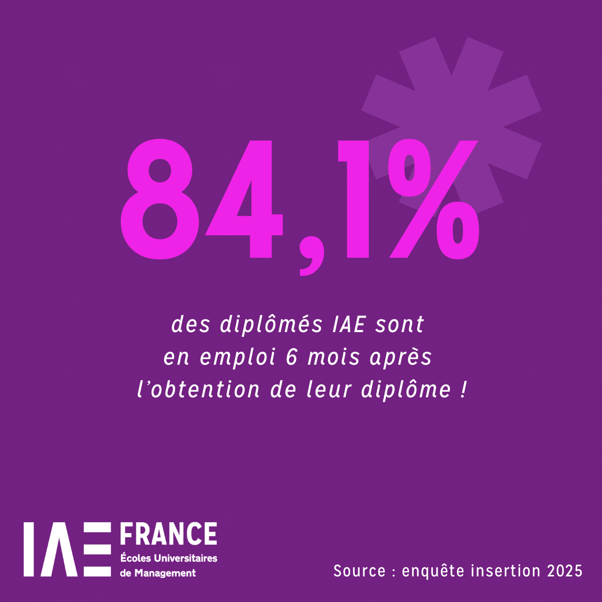 En 2025 et pour la 3ème année consécutive, nous avons déployé une enquête nationale afin d’évaluer l’insertion de nos jeunes diplômés. Les résultats de cette enquête confirment que les dispositifs de professionnalisation mis en place par les IAE rendent les étudiants opérationnels, et donc attractifs pour les entreprises.