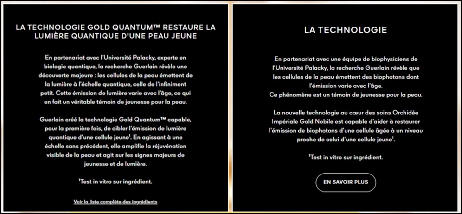 La marque défendait en effet « une nouvelle voie de réjuvénation cosmétique pour la peau, née de la science quantique » et soulignait qu’elle est le fruit d’un partenariat avec des chercheurs de l’université Palacky en Tchéquie.