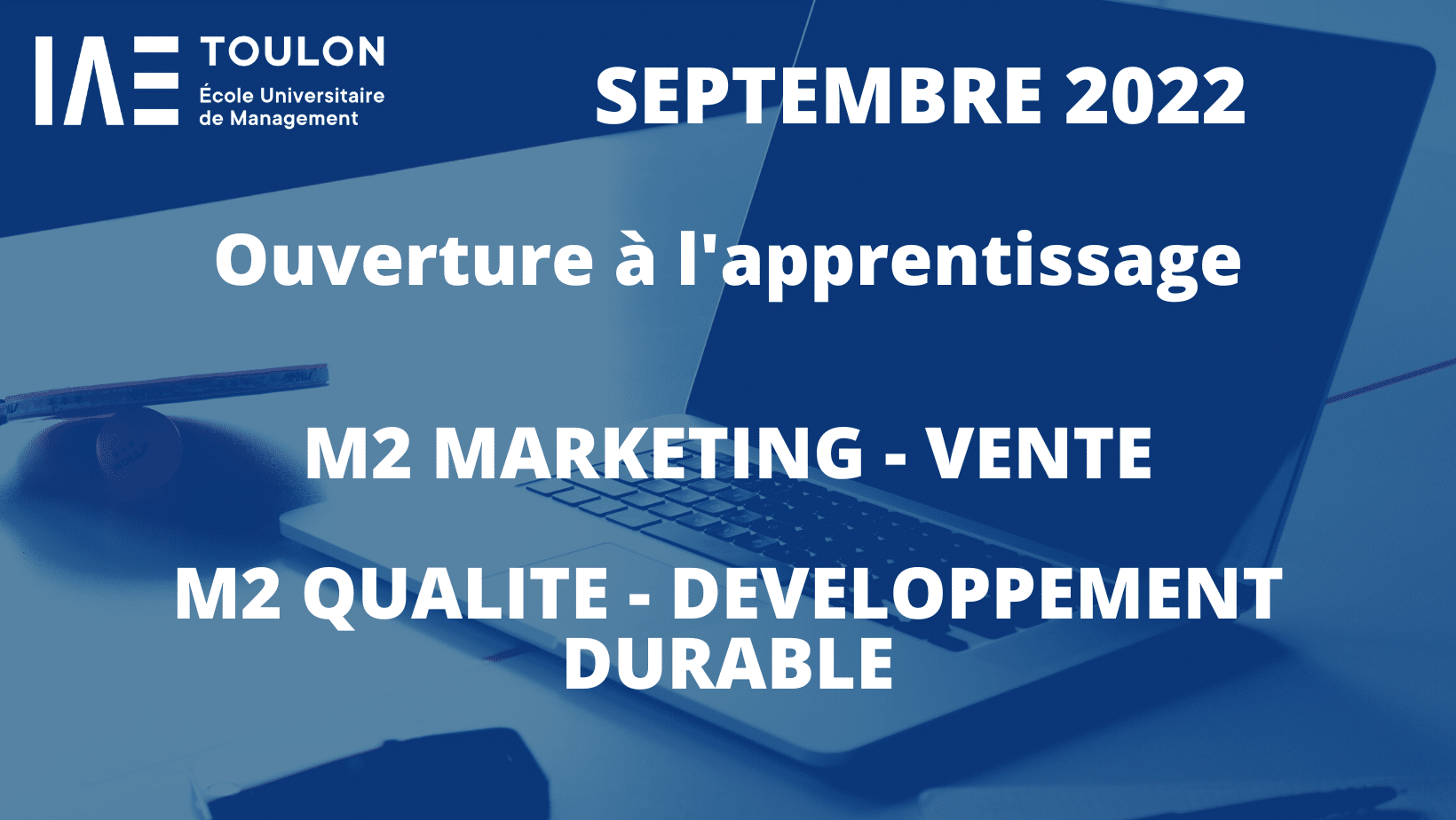 Après avoir développé l’apprentissage en licence professionnelles métiers de la gestion et de la comptabilité, à partir de la rentrée 2022, l’IAE Toulon offre la possibilité à ses étudiants de suivre le Master 2 Management de la Qualité et du Développement durable ainsi que le Master 2 Marketing-vente en apprentissage.
