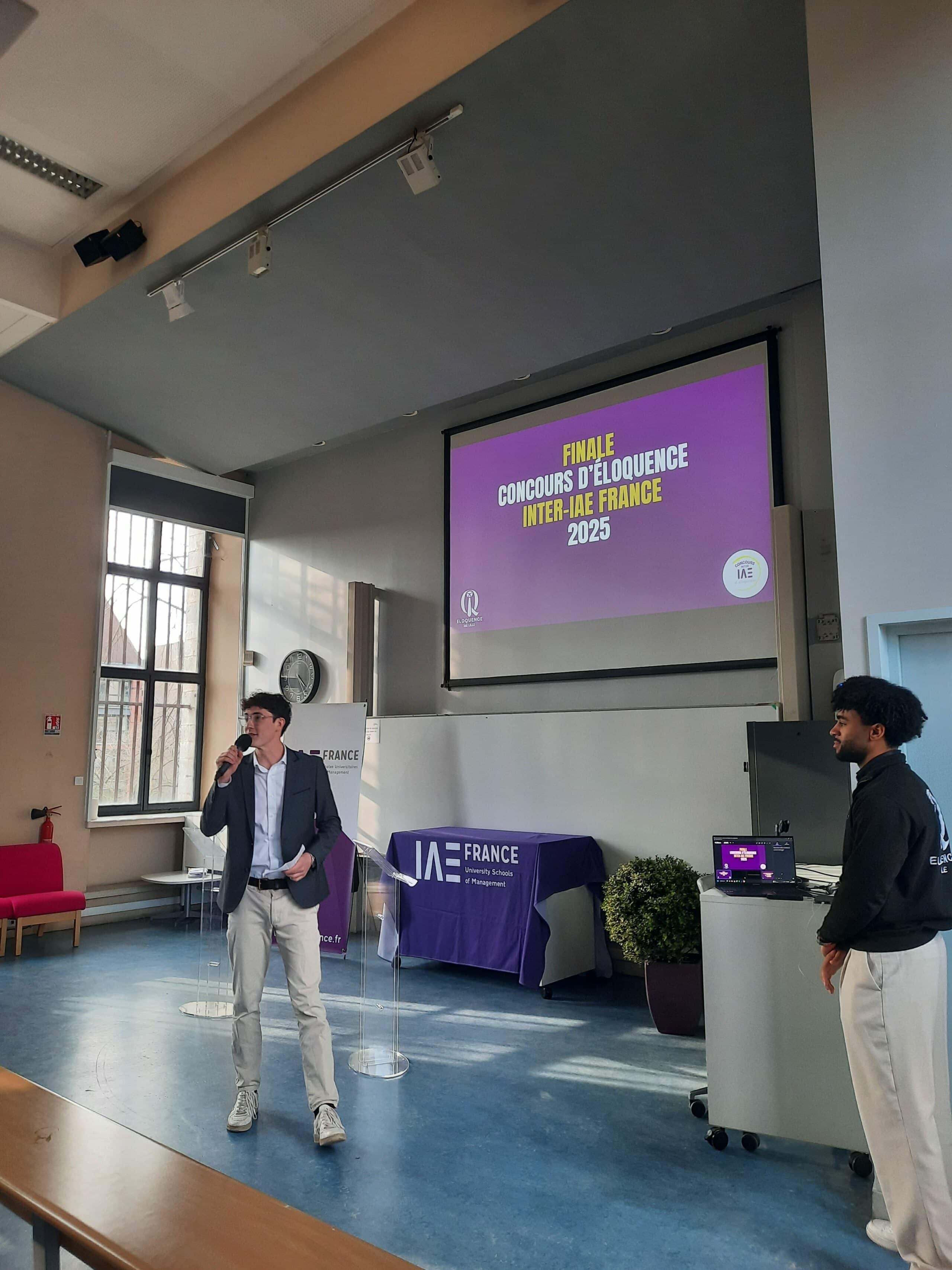 Le samedi 15 mars dernier, l’IAE Lille a été le théâtre d’une joute oratoire d’exception : le Concours d’éloquence inter-IAE 2025. Organisé par les étudiants du projet Éloquence IAE Lille pour la 2ème année consécutive, cet événement a rassemblé 39 participants représentant 11 IAE : IAE Caen, IAE Lille, iaelyon, IAE Nancy, IAE Nantes, IAE Nice, IAE Perpignan, IAE Rouen, IAE Saint-Etienne, IAE Savoie Mont Blanc et IAE Valenciennes, pour une compétition placée sous le signe de la rhétorique, de la persuasion et du partage.