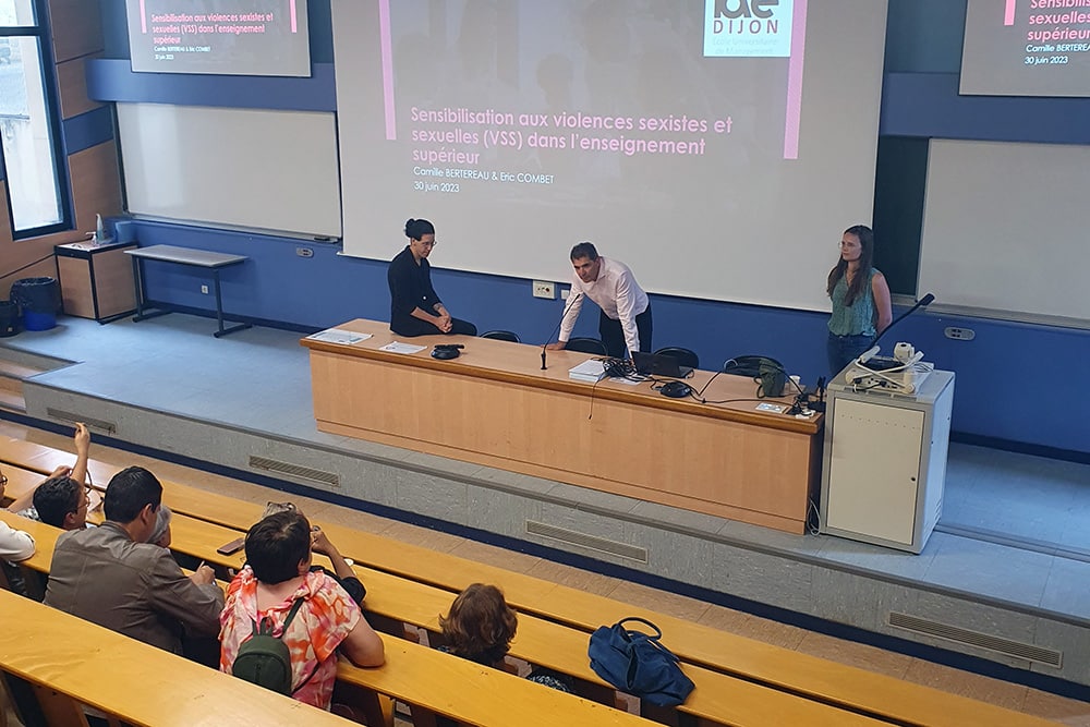 - Intervention des référents égalité et diversité sur les violences sexistes et sexuelles (VSS) dans le milieu de l’Enseignement supérieur. Camille Bertereau et Eric Combet ont présenté les lois et procédures existantes pour accompagner les victimes. Grâce à leur intervention, l’équipe a pu être formée à l’écoute et à l’orientation des personnes confrontées à des situations de harcèlement.