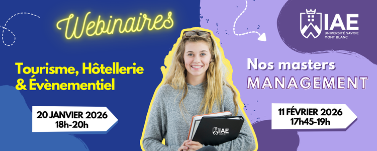 Vous souhaitez vous orienter ou poursuivre vos études dans les domaines du tourisme, de l’hôtellerie, de l’événementiel ou du management ? L’IAE Savoie Mont Blanc vous invite à participer à deux webinaires d’information animés par les équipes pédagogiques, pour découvrir nos formations et échanger directement avec les enseignants. 🔹 Webinaire Tourisme, Hôtellerie & Événementiel :...